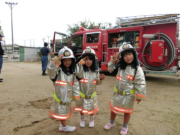 子どもたちは、避難訓練の経験も重ね、静かにあわてず、避難することができました。そしてその後は、消防士さんの重た〜い、かっこいい!服を着せてもらったり、消防車に乗せてもらったり!と楽しい時間を過ごすことができました。
