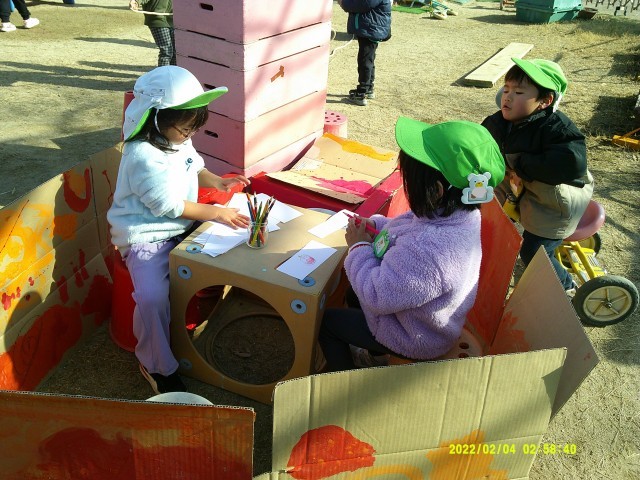 左)次の日、乾いた段ボールと箱・巧技台を見つけ、「お家つくりたい。」と声をかけてきました。「どうぞ、どうぞー」としばらく経って見ると素敵なお家が出来上がってきていました。「絵 描きたい!」という声からまたまたあそびが深まっていきました。今日あそんだあそびがまた次の日につながっていくことで、より一層あそびやともだち同士の関係が深くなっていくのですね。