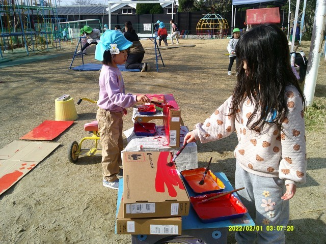 右)園庭での一つのあそびとして残っていた絵の具と段ボール(開いたものと箱)を「誰でもどうぞー。」と用意していました。「やってみよう。」「やりたい。」という子どもたちが代わる代わるやってきて好きな時間だけペンキやさんの様に思い思いに絵の具時間を過ごしていきました。しっかり端までキレイに塗ろうとするのは5歳児の子どもたちでした。