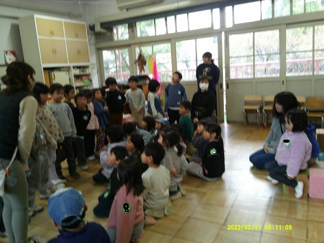 お帰りの前にそら組(5歳児)のみんながにじ組(4歳児)の部屋にやってきました。「明日はおにぎり🍙パーティーです。おにぎりの券を持って来てください。」というお知らせでした。「私のもあるのかなぁ。」と、自分のおにぎり券がちゃんとあるかどうかが気になるにじ組の子どもたちです。「これは〇〇ちゃんて書いてあるわぁ。おにぎりが描いてあるね。」等々、一枚一枚どんなおにぎり券があるのか楽しみながらみんなで見合いっこをしました。