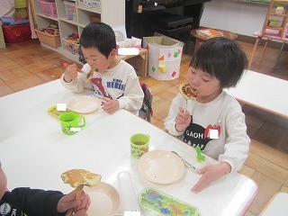 保育室中に甘い良い香りが広がると、、「早く食べたーい!」「自分でひっくり返したの食べる!!」と待ちきれない様子の子どもたち。