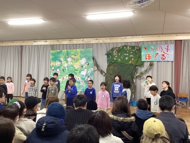 そら組は、幼稚園最後の生活発表会。クラスの友達と今まで進めてきたことを早くおうちの人に見てもらいたいと感じている様子でした。絵本『かしのきホテル』より、そらのきホテルで登場人物の心情を追って劇遊びを進めてきました。楽器や歌も一生懸命取り組む子どもたち。
