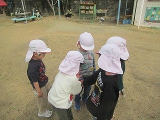 警察になりきって、追いかけっこをすることが好きなはな組さん。「ぼく、警察(になりたい)!」「じゃあ、私も!」と仲間が増えていき、追いかけっこが始まろうとしたそのとき、、、「えいえいおーしよ!」「いいね」「警察チームがんばるぞ!えいえいおー!」と聞こえてきます。「子ども達だけで、掛け声を掛けたり、集まったりできるの!?すごい!!」と見守りつつ、びっくりしていた担任です。その背景にはきっと、同じ園庭で毎日遊ぶそら組さんやにじ組さんの姿をよく見て、聞いていたことや、大きい組さんへの憧れなどがあったのだと思います。