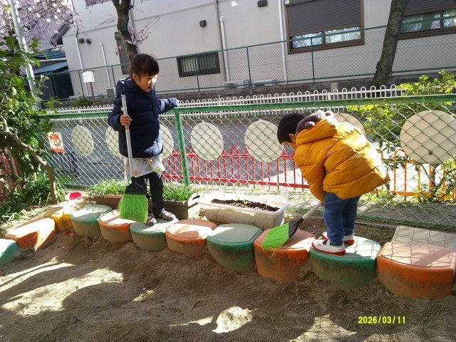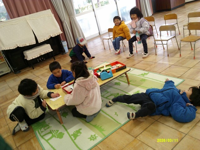 だいたいいつも決まった時間に決まった子どもたちが朝、幼稚園にやってきます。年度末この時期になってくると、そんな子どもたち同士もすっかりお互いのことを分かり合っている様子がうかがえます。基本は遊戯室で過ごしていますが、「先生のすることをしたい…。」「お手伝いをしたい。」という気持ちから自らほうきを手にしている姿を見つけることもあります。また、朝はその時の生活リズムや気持ちのコンディションによって様子や表情も違います。遊びはじめるまでに時間がかかったり、遊びに向かわずゴロゴロと過ごしたり椅子に座ってみんなのことを見ていることもOKです。3歳児から5歳児までの縦の関係性がほんわかと深まってきています。一緒に過ごしている顔ぶれももう少しすれば変わっていきますね。