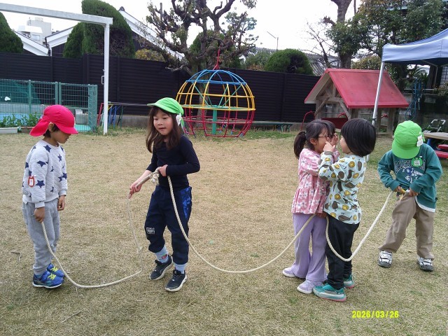 年度末、春の預かり保育も今日を残すのみとなりました。早く咲いていた桜の花びらが散りはじめ、今はソメイヨシノの花が咲き始めました。子どもたちは朝から夕方まで本当に【ほっこり】あそび時間をゆったりと過ごしています。楽しそうなあそびが始まっていると、自然に異年齢の子どもたちも交わりながらあそびが広がっています。今日は「外で食べたい!」のリクエストに応えて室内と外を選んで、みんなを感じながらのお弁当タイムとしました。「みんなで今から○○が始まるから○○しようか」の声も届き、メリハリのある生活を過ごしています。