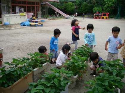 毎日,少しずつ色が赤に変わっていく,いちごを「もう食べられるかなぁ」と楽しみにしている子どもたちの姿がありました。みんな一つずつ,いちごを収穫して食べました。