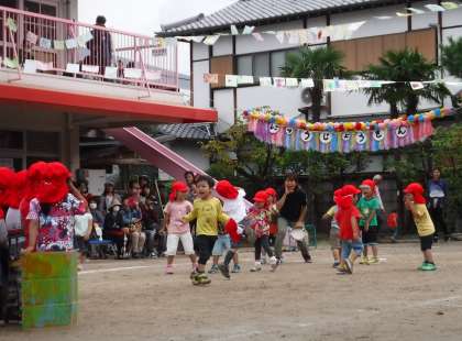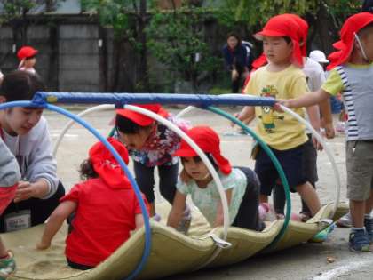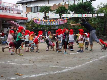 みんなで一緒に遊ぶ雰囲気を楽しみながら,一人一人が安心して遊びを楽しめるようにとかかわっています。初めての運動会。みんな,よく頑張りました。