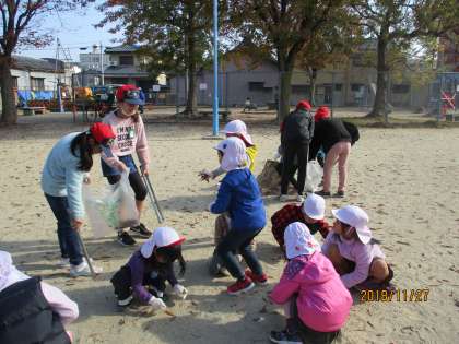 小春日和のような温かな日差しの中,小学生や地域の方と一緒にごみや落ち葉を拾いました。