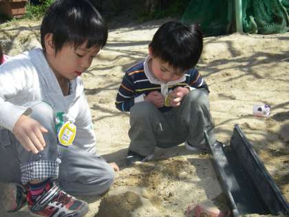 4歳児の子どもたち。二人で一緒に砂場で遊んでいます。