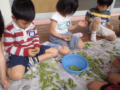 「きいだなぁ」「いいにおいがする!」と話して、むいた豆をかごに入れていました。