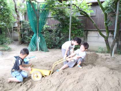 砂場の砂が園庭に流れていっていたので砂をかいて砂場に戻しました。