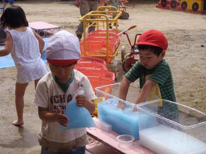 うっかり落としたビニール袋に穴があいていて、知らずに色水を入れてみるとピューッと水が飛び出してきました。「くじらさんや!」「こんなに遠くまで飛んだ!」と大喜びです。たくさんの穴があいて、いろいろなところから水が飛び出すことも大喜び!