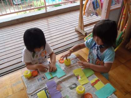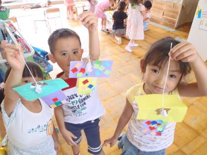 年中組の織姫様と彦星様は折り紙を2枚組み合わせて星を顔にして作りました。日々のお手紙を大事に折って持ち帰っていたこともあり,折り紙も半分にきれいに折ることができるようになりました。千代紙や折り紙で飾りをつけて自分だけの飾りができました。