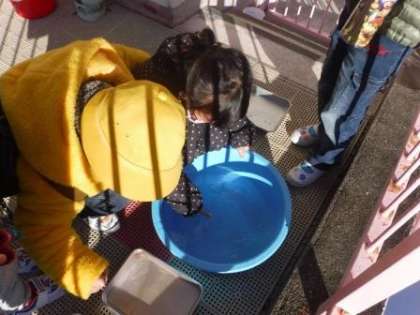 朝,幼稚園に来たら氷がはっていました。