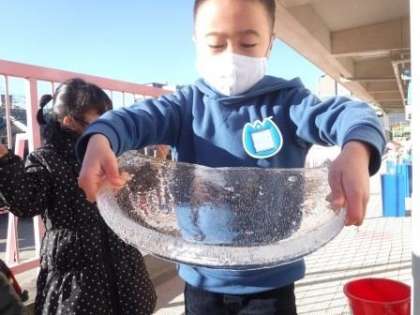 タライにできた氷を見てびっくり!
