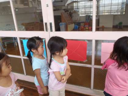 たんぽぽ組さんが2階から引っ越してきたので、2階のたんぽぽ組のお部屋には誰もいません。工事中のため窓も開けられません。子どもだけで入っては危ないので、“入ってはいけません”の×印のポスターをつくって貼りました。