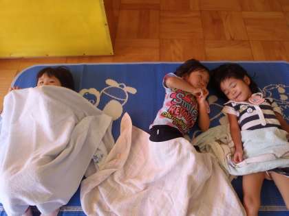 久しぶりの登園、久しぶりのプール遊びで「ねむたーい!」という子どもたち。「ちょっとお昼寝しようか」とござを敷いてごろんと横になりました。ゆったりほっこりした時間がとてもうれしいね。