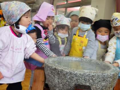 臼を温めてからお餅つきをすることを