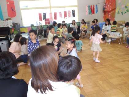 お家の人とふれ合って遊ぶだけでなく、お友達のお母さんの膝にも乗せてもらい、ゆらゆらゆれながら楽しむことができました。