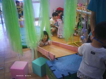 3歳児は、お部屋に素敵な滑り台ができて、友達と一緒に滑ることを楽しんでいました。