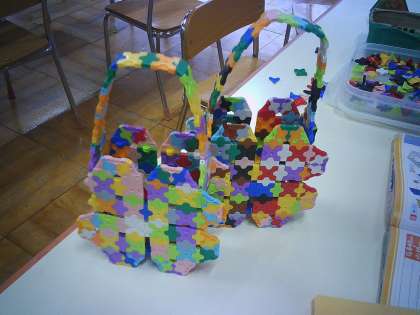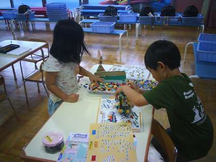 預かり保育では、最近、年長組のこどもたちが、ラキューといわれる知育玩具でよく遊んでいます。作り方の本を見ながら、同じパーツを探し、つなげていき、立体的な作品をつくっています。