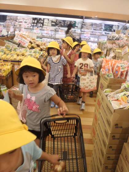 6月26日(火)にジャガイモ堀に行き、カレーパーティーに使うジャガイモも掘ってきました。それからカレーをつくることに楽しみをもっていた子どもたち。いよいよ明日がカレーパーティーになり、今日はその準備をするためにカレーに必要な材料を、年長児たちが買い物に行きました。
