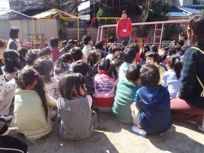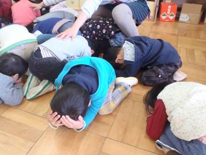 今日3月11日は,東日本大震災が起こった日です。被災地への鎮魂の思いを共有し,改めて災害への意識を再認識するため,京都市内全域で「京都市シェイクアウト訓練」が行われ,伏見住吉幼稚園もその取り組みに参加しました。