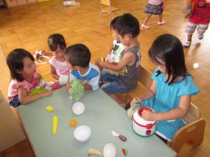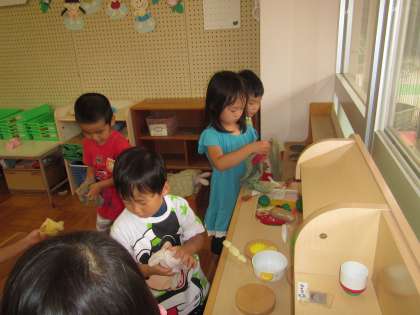 「お茶碗する」「私はにんじんする」 「これ(お皿)私がする」「僕が先にするんやで」とちょっととりあいもしながらままごとを雑巾できれいに拭きました。