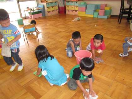 3歳児 はな組 みんなで部屋をきれいに掃除したよ