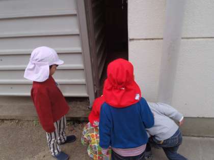 今度は園舎の隙間を覗き込みます。