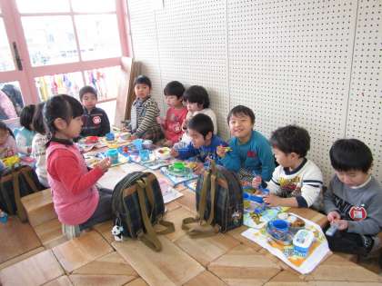 お家の人がつくってくれたお弁当は子ども達の大きな楽しみです。「今日はオムライスだよ」「たまご焼き,一緒!」「おかあさんのお弁当,大好き」と会話もはずみます。