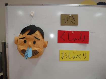 咳をすると、ばい菌が新幹線と同じスピードで3m飛んでいき、くしゃみをすると、ばい菌が台風の風と同じスピードで5m飛んでいることを伝えました。そして、おしゃべりをすると1mも飛んでいってしまうことを伝えました。空気が乾燥していたらこの距離の2倍以上飛ぶこともあります。