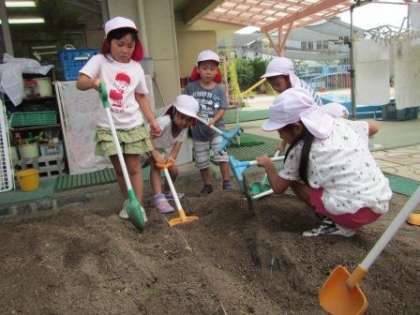 美味しい大根を育てるために,みんなで大根の種の土のふとんづくりをしました。「大きい大根になるように…」,「美味しいのができますように…」と子どもたちは土を掘り起こしたり,平らにしたりしていました。今までに土づくりをした経験や砂場で砂を掘って遊んだ経験からなのか,慣れた手つきで土づくりをしている子どもたちにとても驚きました。大きくて美味しい大根になるといいね!