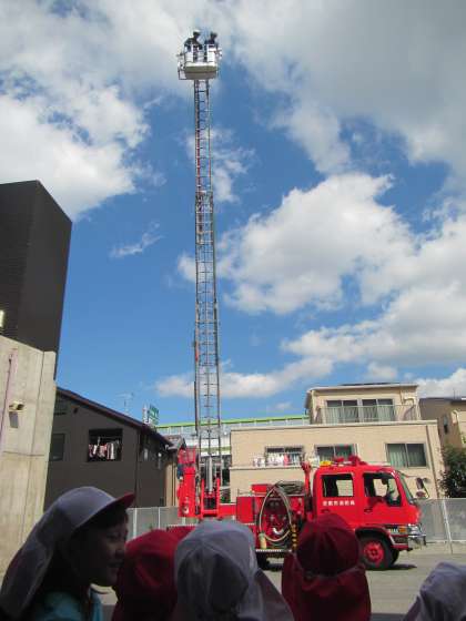 はしご車のはしごがグングンと伸びていくのを,「すごい」と歓声をあげながら見たり,消防自動車の周りをぐるりと回りながら,消防隊の方にいろいろと質問したりしました。