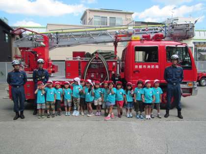 伏見消防署のみなさん,子どもたちの質問に丁寧に答えてくださったり,リクエストに応えて,ホースや運転席なども見せてくださったりするなど優しくかかわっていただき,ありがとうございました。