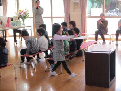 終業式では,園長先生から,一人一人に「めざせ100さつ!親子で絵本」の賞状をもらいました。修了式での年長児の姿をよく見ていた子どもたち。おじぎをしたり,大事に賞状をもらったりと1年の成長を感じる姿が見られました。