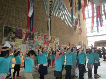 たくさんの鯉のぼりや鎧兜が展示されるエントランスホールで,元気いっぱい歌ったり,踊ったりすることを披露し,地域の方や保護者の方に喜んでいただきました。