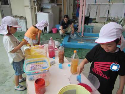 水を加えると,色水が増えることがわかり,自分たちで量を増やしながら遊んでいました。