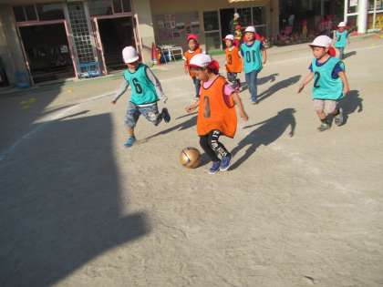 天気も良く,園庭で元気いっぱい走ったりボールを蹴って遊んだりすることを楽しみました。運動会が終わってからみんなで力を合わせて頑張る姿が見られるようになり,サッカー遊びの中でもゴールにボールが入るとみんなで喜んだり,勝てるようにみんなで必死にボールを追いかけたりする姿が見られました。コーチの「○チーム1てーん」「△チーム1てーん」という声が園庭に響き渡る楽しいサッカー遊びとなりました。