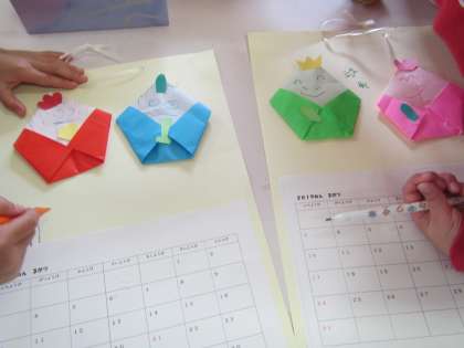 3月の折り紙遊びでは「おひなさま」を折りました。折り方の見本を見ながら自分で折ったり子ども同士教えあったり,一つ一つ「これで合ってる?」と確かめながら折ったり…と様々な姿が見られました。そして折れたおひなさま,おだいりさまに目や口をかいたり飾りをつけたりして,自分だけのカレンダーを楽しんでつくることができました。