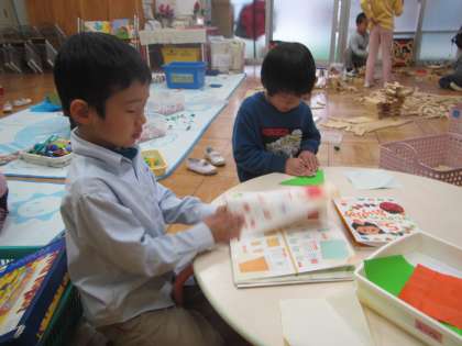 また毎月季節の折り紙遊びを楽しんできたこともあり,好きな遊びをする日も折り紙の本を見ながら折り紙遊びを楽しむようにもなりました。