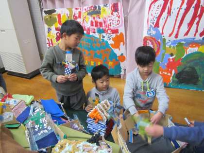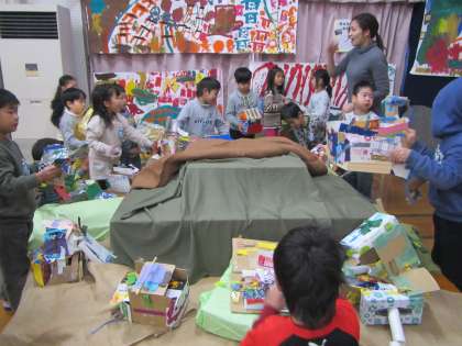 「明日から遊戯室が美術館になる!」と子どもたちは嬉しそうに,自分たちでつくった家や消防車を遊戯室に飾っていました。