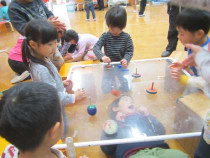 また透明版を用意したところ,4歳児はこまを回し板の下からこまが回る様子を見て楽しだり,トランプで遊んだりとなかよし会の方々と一緒に楽しく遊びました。