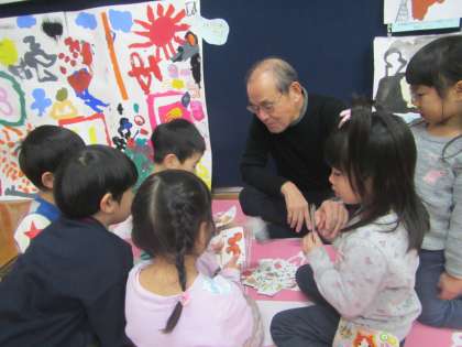 先ずは3学期の始業式でもらったお年玉の「こま」を使ってこま回し!自分のこまなので「回せるようになりたい」という思いが伝わってきました。5歳児は紐を巻くのが難しく,なかよし会の方に「巻き方を教えて」と紐の巻き方や回し方のコツなど教えてもらう姿がたくさん見られました。