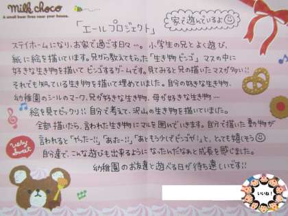 「生き物ビンゴ」の発想にとても驚きました!!テレビやゲームで遊ぶだけではなく,自分たちで遊びを考えて遊べるって素敵だなと思います。兄弟で楽しいビンゴゲームができたんだね!先生たちもやってみたいな〜♪素敵なエールをありがとう!