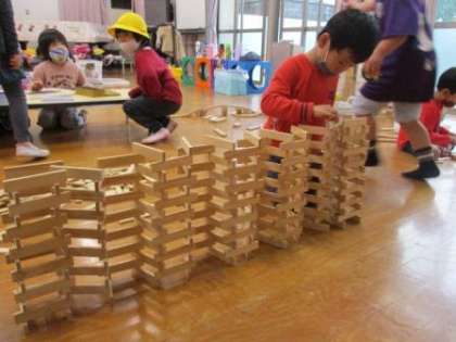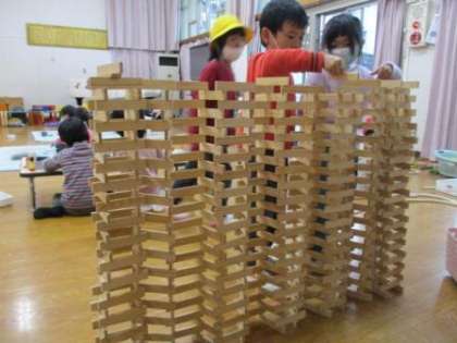 基本の積み方を伝えると「やってみる!」と子ども達も一緒に積んでいきました。どんどん積み上げていき・・・さてさてどうなるか・・・