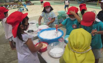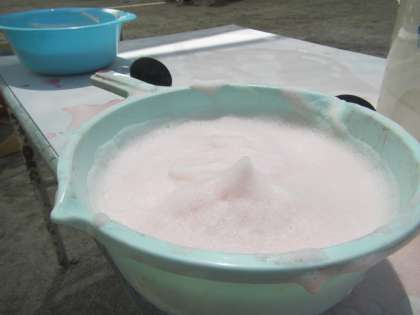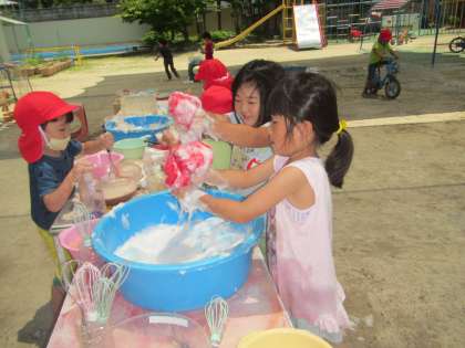 色水遊びを楽しみながらも,泡のふわふわの感触や香りを味わったり,見立てたりして遊べるといいなぁと思い,少量の水を入れたタライに石鹸を入れて,泡立ててみました。
