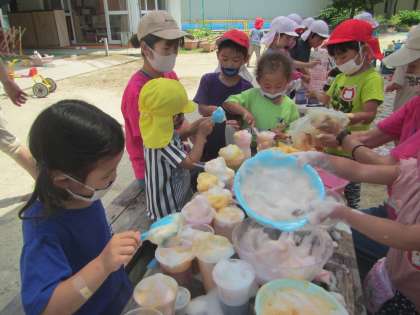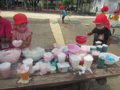 昨日は他の遊びを楽しんでいた子どもたちにも声をかけ誘ってみました。友達の楽しそうな姿やふわっふわの泡を見るとやってみたくなり,早速手に取って楽しみ始めました。