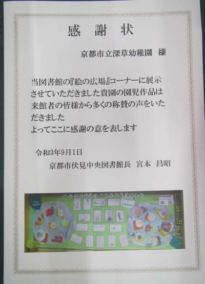 8月中,図書館の『絵の広場』コーナーに深草幼稚園の子どもたちの作品を飾ってもらったお礼,ということで,伏見中央図書館から感謝状が届きました。一人ずつ名前がかいてあって,子どもたちは大喜びで今日持ち帰りました。