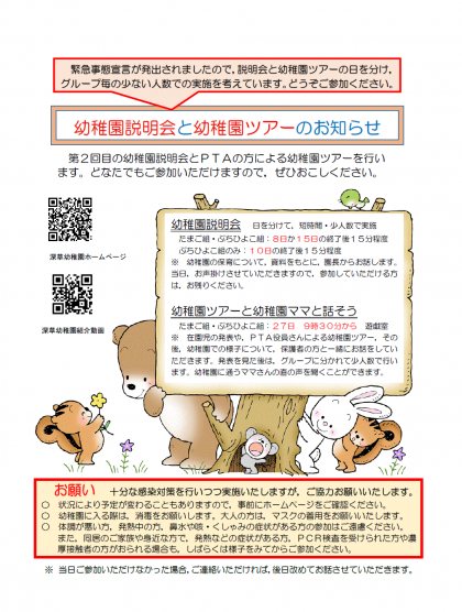 夏休み前にお知らせしていた日程とは変わりますが,『幼稚園説明会』を実施いたします。たまご組・ぷちひよこ組が終わった後,短時間・少人数で園長から資料をもとにお話させていただきます(8日・10日・15日のいずれか)。また,27日には,現役ママさんとお話をしたり,幼稚園ツアーをしたりしてもらう計画です。